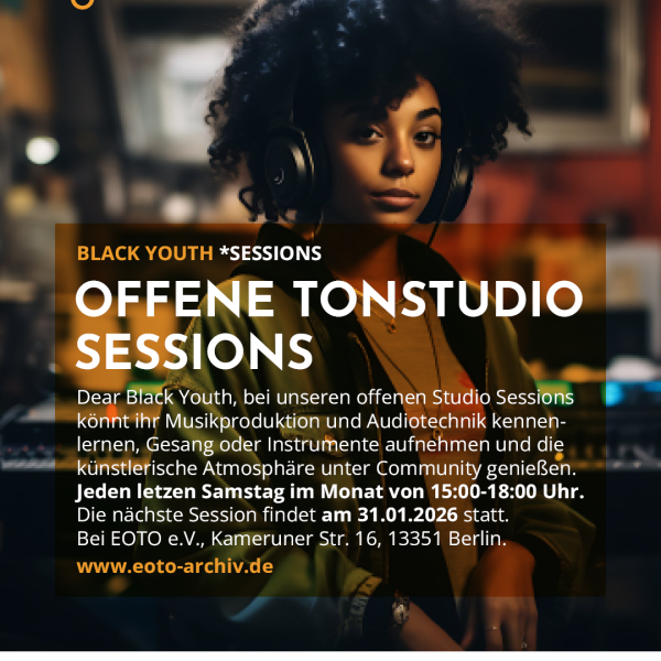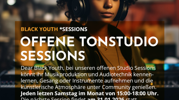 Dear Black Youth, bei unseren offenen Studio Sessions könnt ihr Musikproduktion und Audiotechnik kennenlernen, Gesang oder Instrumente aufnehmen und die künstlerische Atmosphäre unter Community genießen.