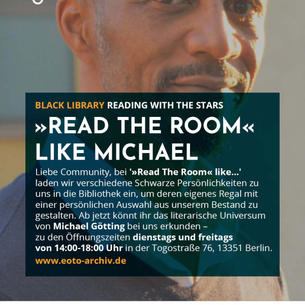 Liebe Community, bei '»Read The Room« like...' laden wir verschiedene Schwarze Persönlichkeiten zu uns in die Bibliothek ein, um deren eigenes Regal mit einer persönlichen Auswahl aus unserem Bestand zu gestalten. Ab jetzt könnt ihr das literarische Universum von Michael Götting bei uns erkunden – zu den Öffnungszeiten dienstags und freitags von 14:00-18:00 Uhr in der Togostraße 76, 13351 Berlin.