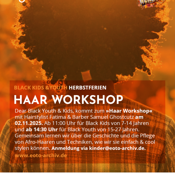 Dear Black Youth & Kids, kommt zum »Haar Workshop« mit Hairstylist Fatima & Barber Samuel Ghostcutz am 02.11.2025. Ab 11:00 Uhr für Black Kids von 7-14 Jahren und ab 14:30 Uhr für Black Youth von 15-27 Jahren. Gemeinsam lernen wir über die Geschichte und die Pflege von Afro-Haaren und Techniken, wie wir sie einfach & cool stylen können. Anmeldung via kinder@eoto-archiv.de.