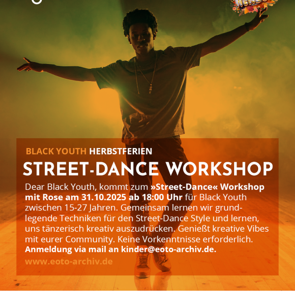 Dear Black Youth, kommt zum »Street-Dance« Workshop mit Rose am 31.10.2025 ab 18:00 Uhr für Black Youth zwischen 15-27 Jahren. Gemeinsam lernen wir grund-legende Techniken für den Street-Dance Style und lernen, uns tänzerisch kreativ auszudrücken. Genießt kreative Vibes mit eurer Community. Keine Vorkenntnisse erforderlich. Anmeldung via mail an kinder@eoto-archiv.de.